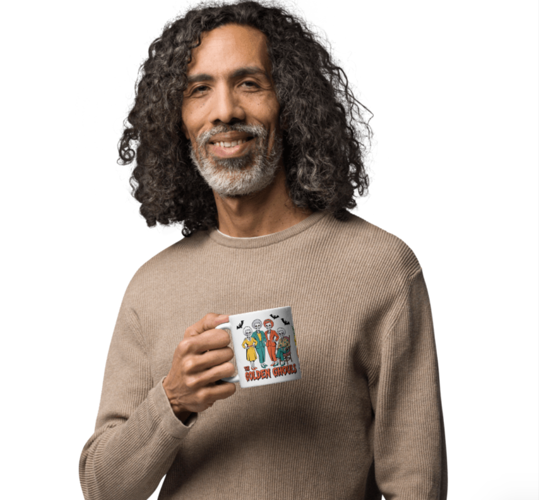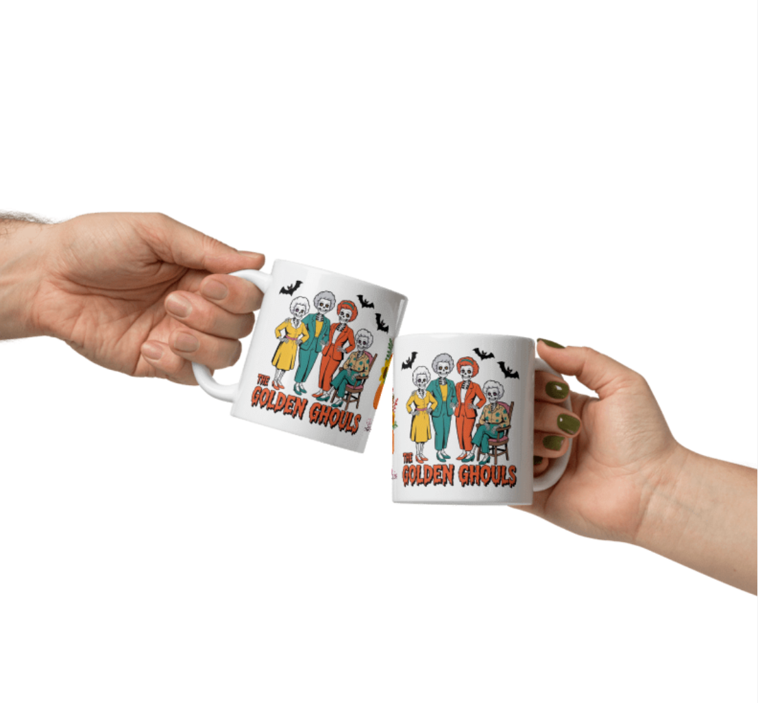 Celebrate Halloween with the 'Golden Ghouls' White Glossy Mug, featuring a unique skeletonized rendition of the iconic Golden Girls alongside charming bats and pumpkins. This glossy ceramic mug combines festive spirit and nostalgic charm, making it a perfect seasonal addition to your kitchen or a distinctive gift for fans. Its durable finish ensures vibrant, long-lasting imagery for daily enjoyment.