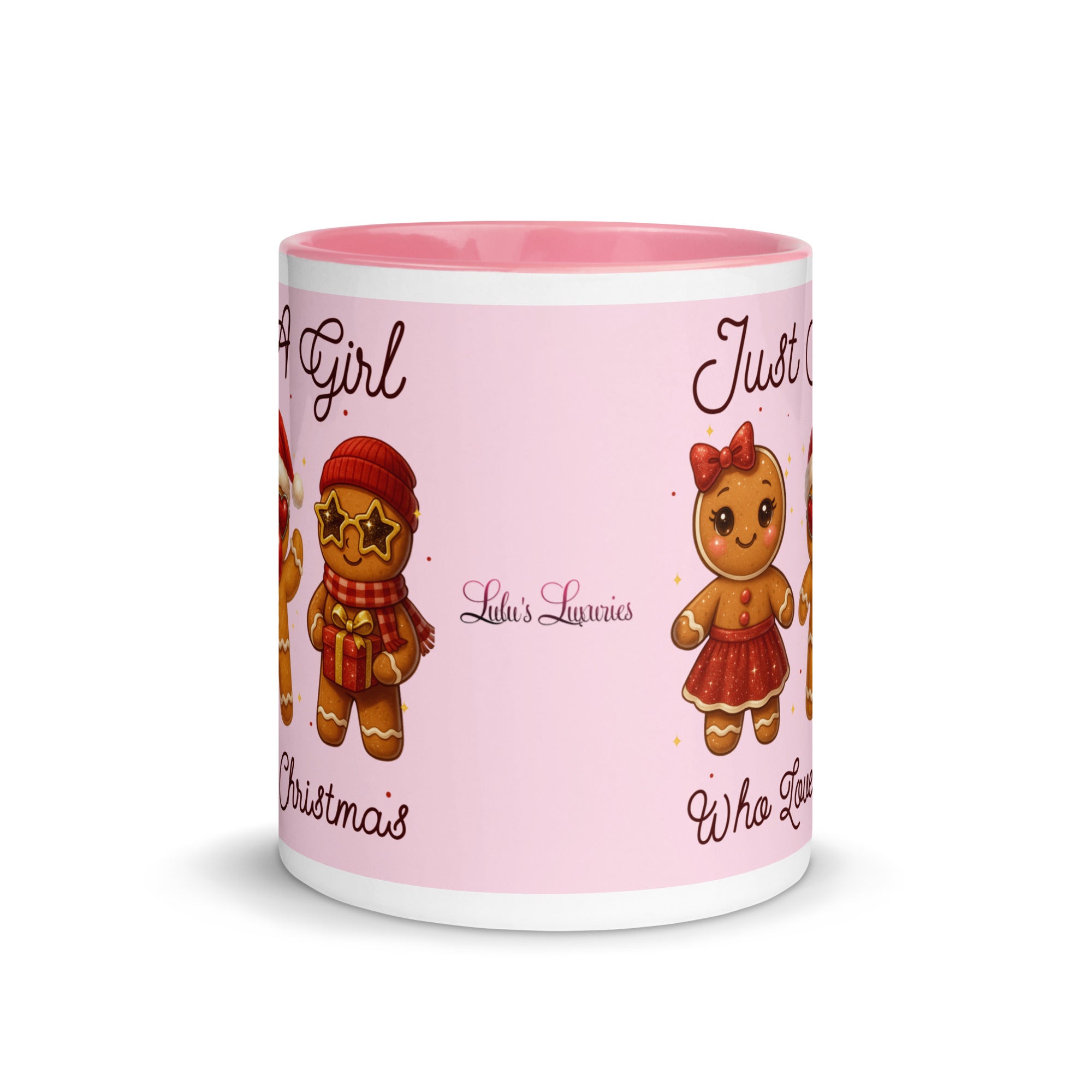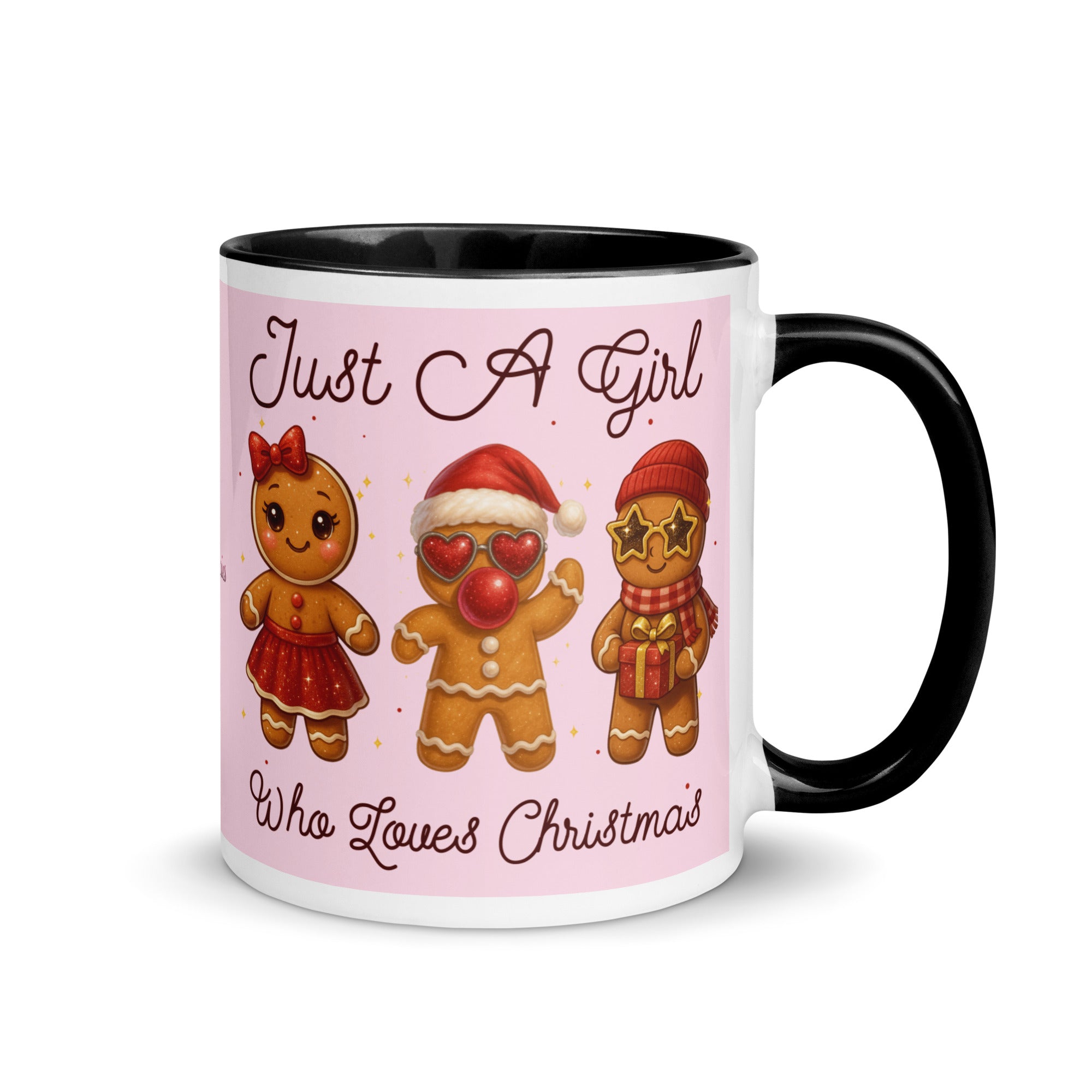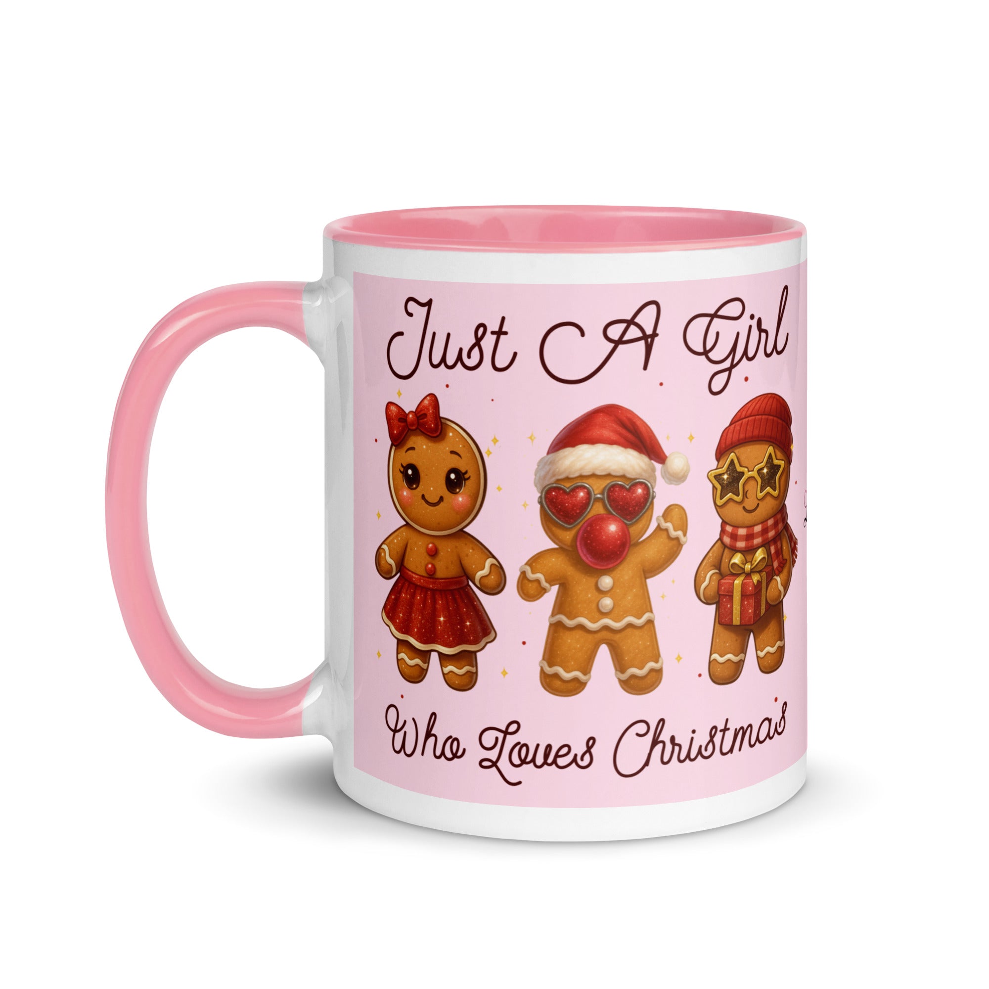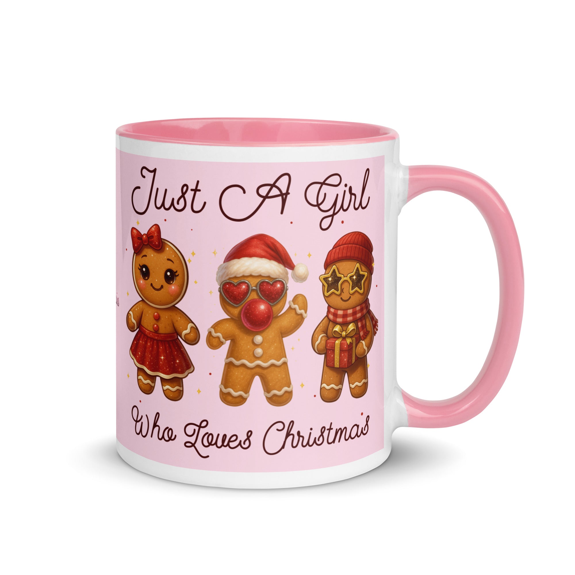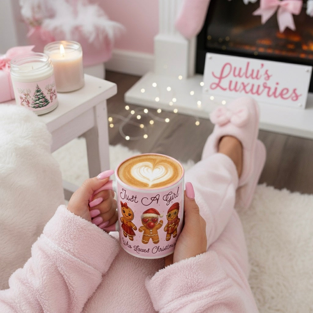 Celebrate the season with this charming mug featuring a soft pink background adorned with festive gingerbread characters. The playful "Just A Girl Who Loves Christmas" message wraps around both sides, making it perfect for holiday coffee breaks or as a thoughtful gift for gingerbread enthusiasts. The colored interior adds a delightful pop of personality to every sip. Ideal for spreading Christmas cheer throughout the season.