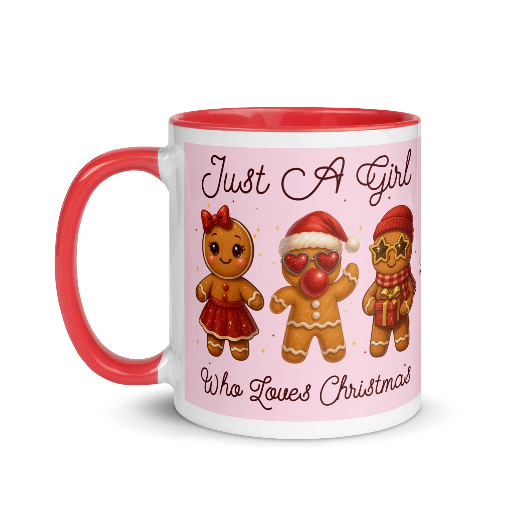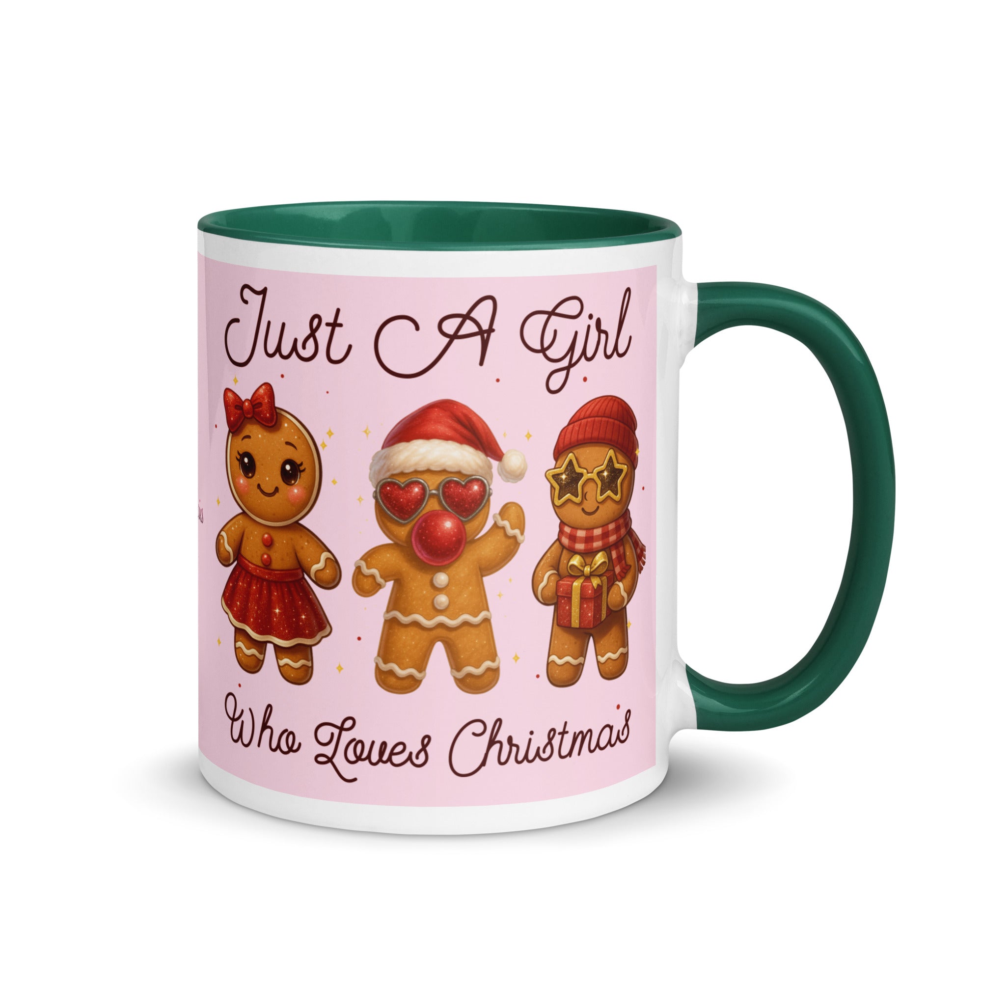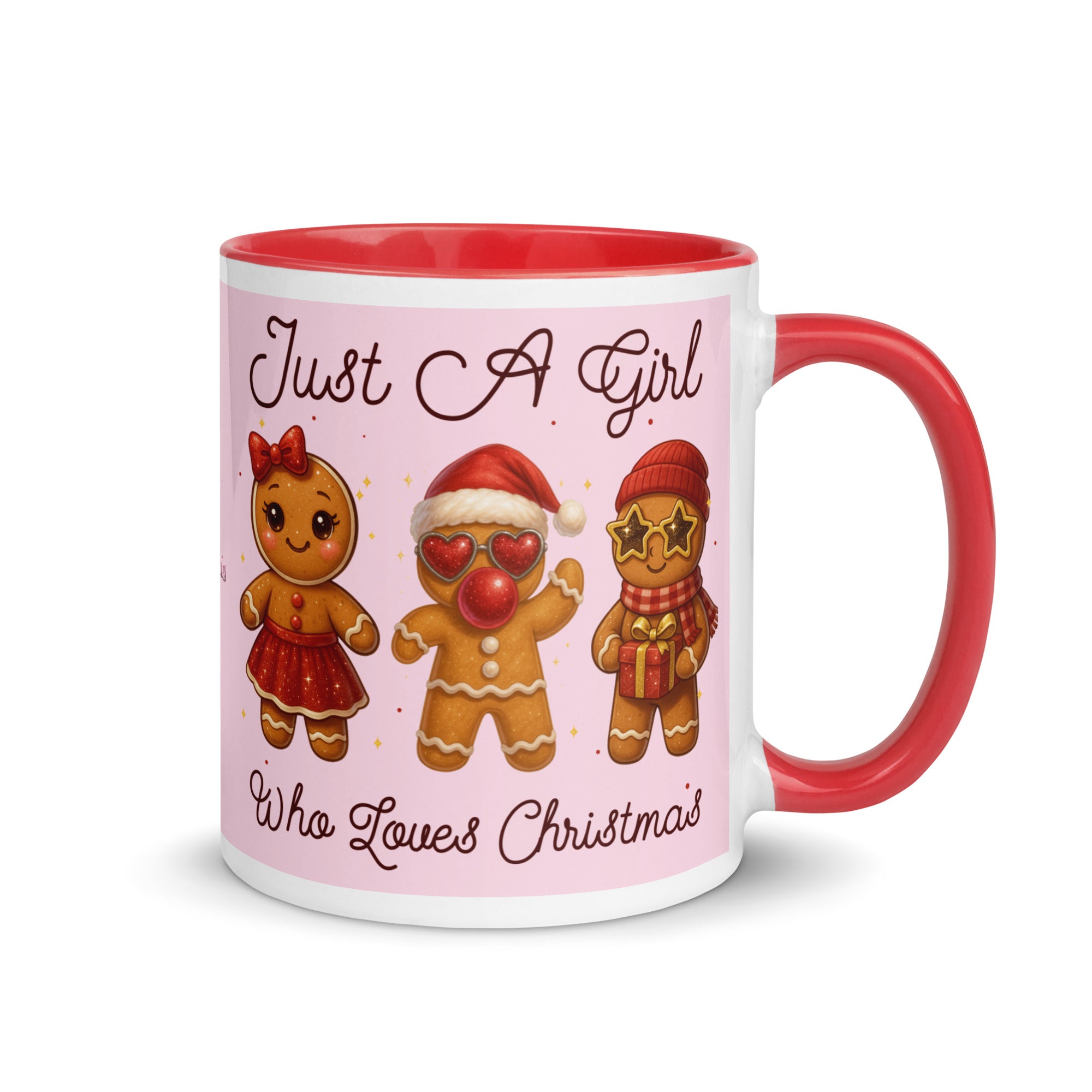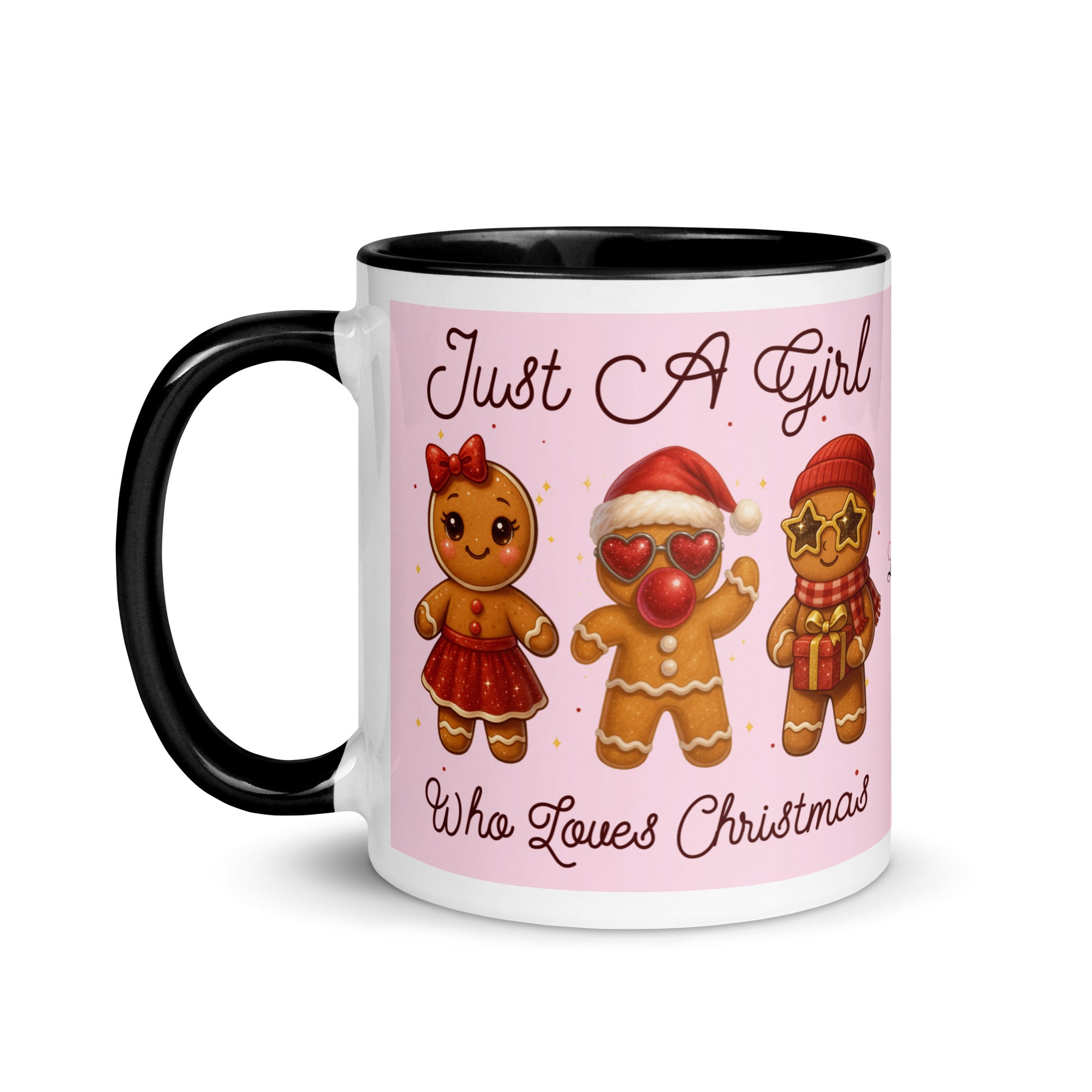 Celebrate the season with this charming mug featuring a soft pink background adorned with festive gingerbread characters. The playful "Just A Girl Who Loves Christmas" message wraps around both sides, making it perfect for holiday coffee breaks or as a thoughtful gift for gingerbread enthusiasts. The colored interior adds a delightful pop of personality to every sip. Ideal for spreading Christmas cheer throughout the season.