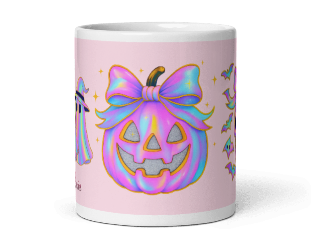 Whether you're drinking your morning coffee, evening tea, or something in between—this mug's for you! It's sturdy and glossy with a vivid print that'll withstand the microwave and dishwasher. It highlights the dreamy rainbow-pastel vibe while keeping it fun, cute, and Halloween-themed.