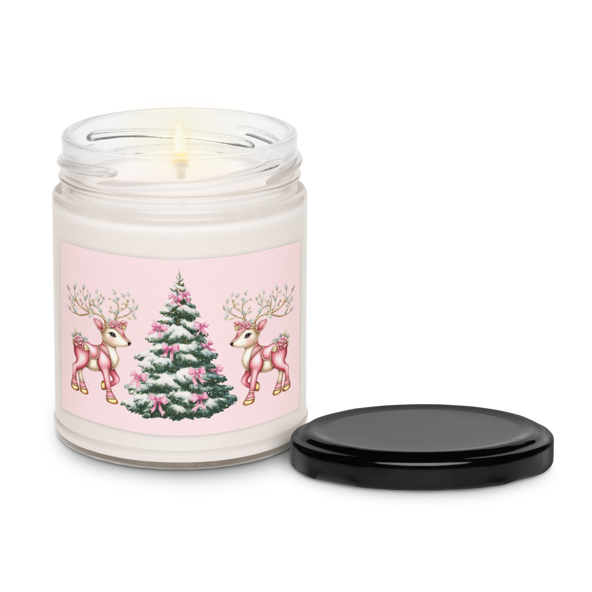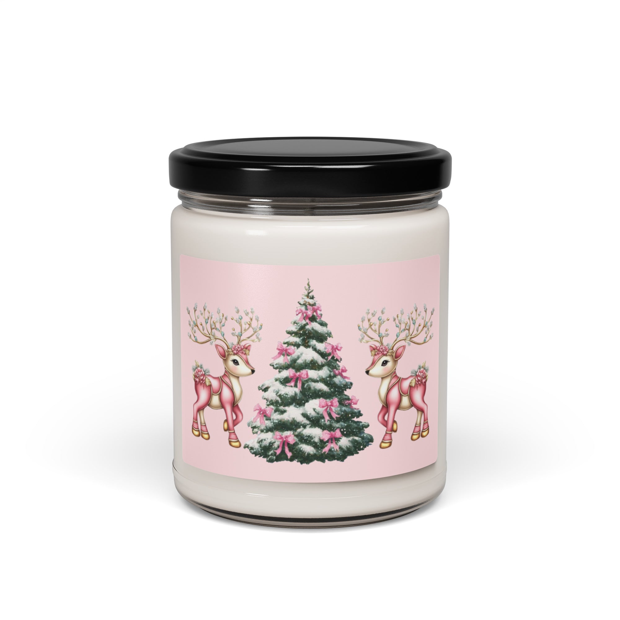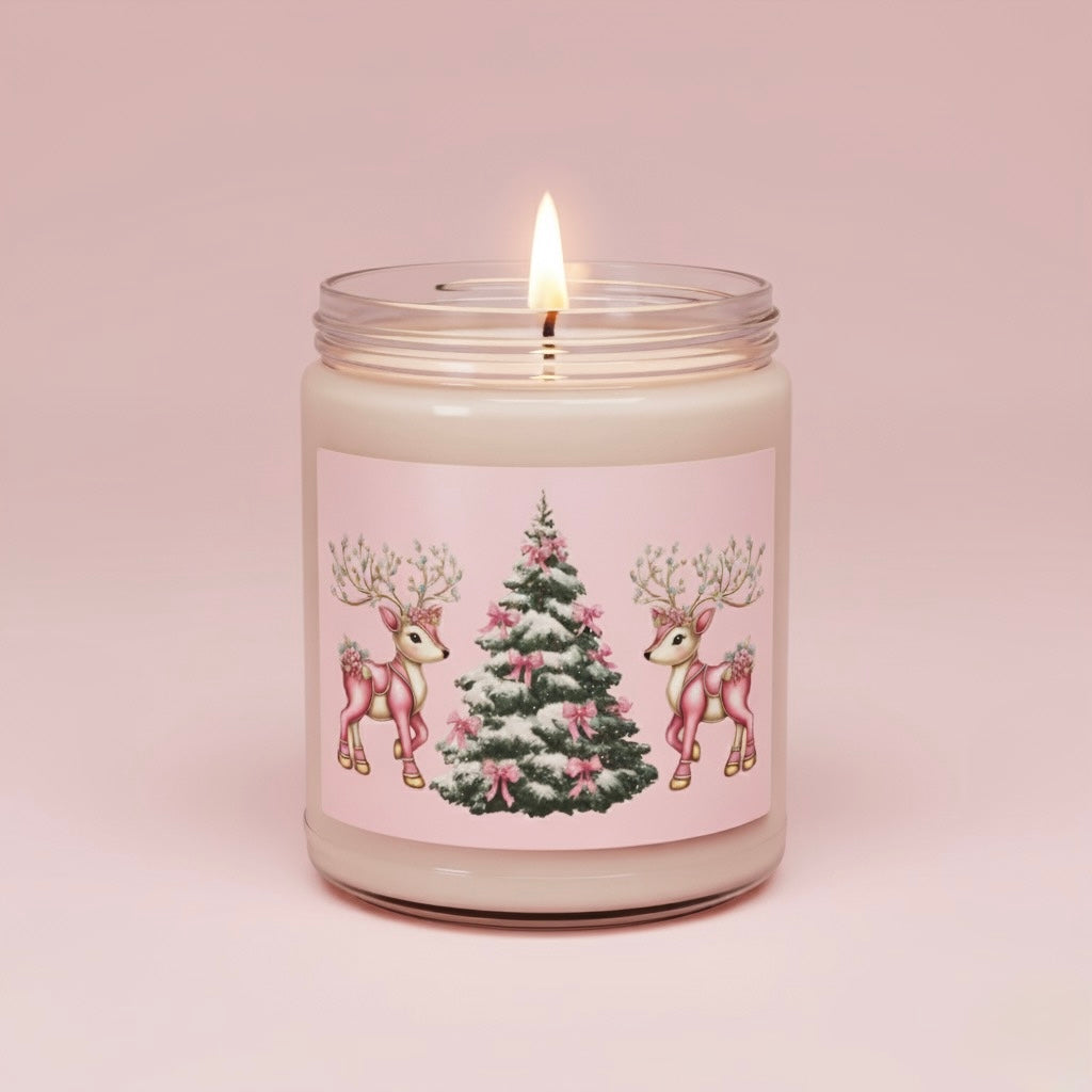The 'Pink Christmas' Scented Soy Candle brings festive warmth with a delicate aroma perfect for the holiday season. Featuring a charming design of two pink deer facing a snow-covered Christmas tree adorned with pink ribbon bows against a soft pink background, this candle adds both visual elegance and seasonal fragrance to any room. Crafted from natural soy, it offers a clean, even burn that enhances your holiday ambiance with subtle, inviting scent notes. Ideal for creating a cozy and sophisticated holiday atmosphere.