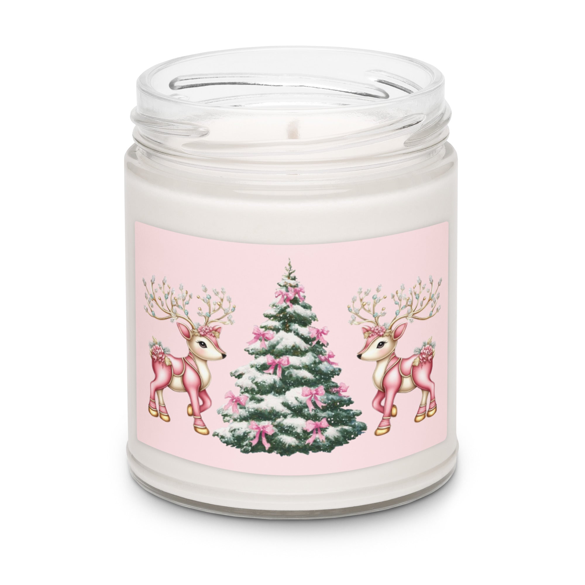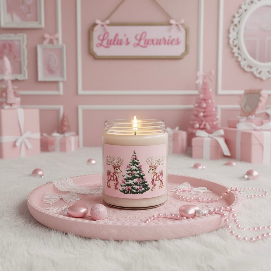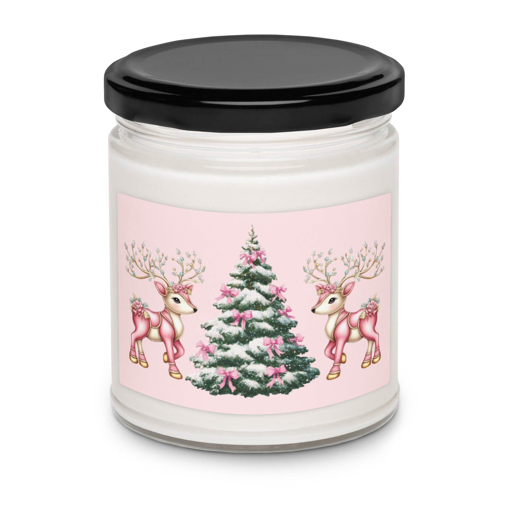 The 'Pink Christmas' Scented Soy Candle brings festive warmth with a delicate aroma perfect for the holiday season. Featuring a charming design of two pink deer facing a snow-covered Christmas tree adorned with pink ribbon bows against a soft pink background, this candle adds both visual elegance and seasonal fragrance to any room. Crafted from natural soy, it offers a clean, even burn that enhances your holiday ambiance with subtle, inviting scent notes. Ideal for creating a cozy and sophisticated holiday atmosphere.