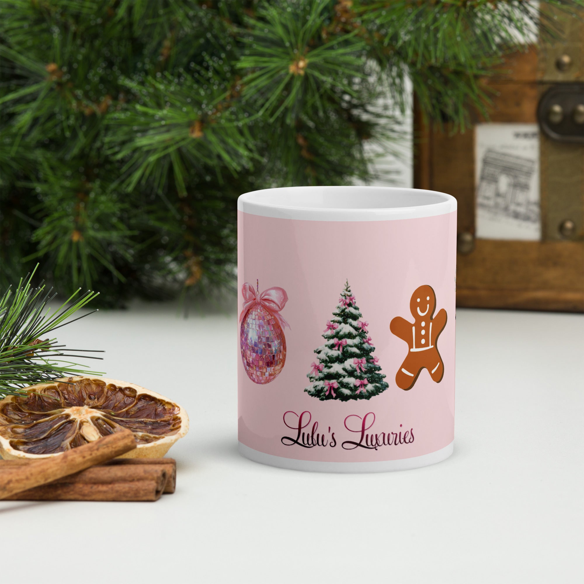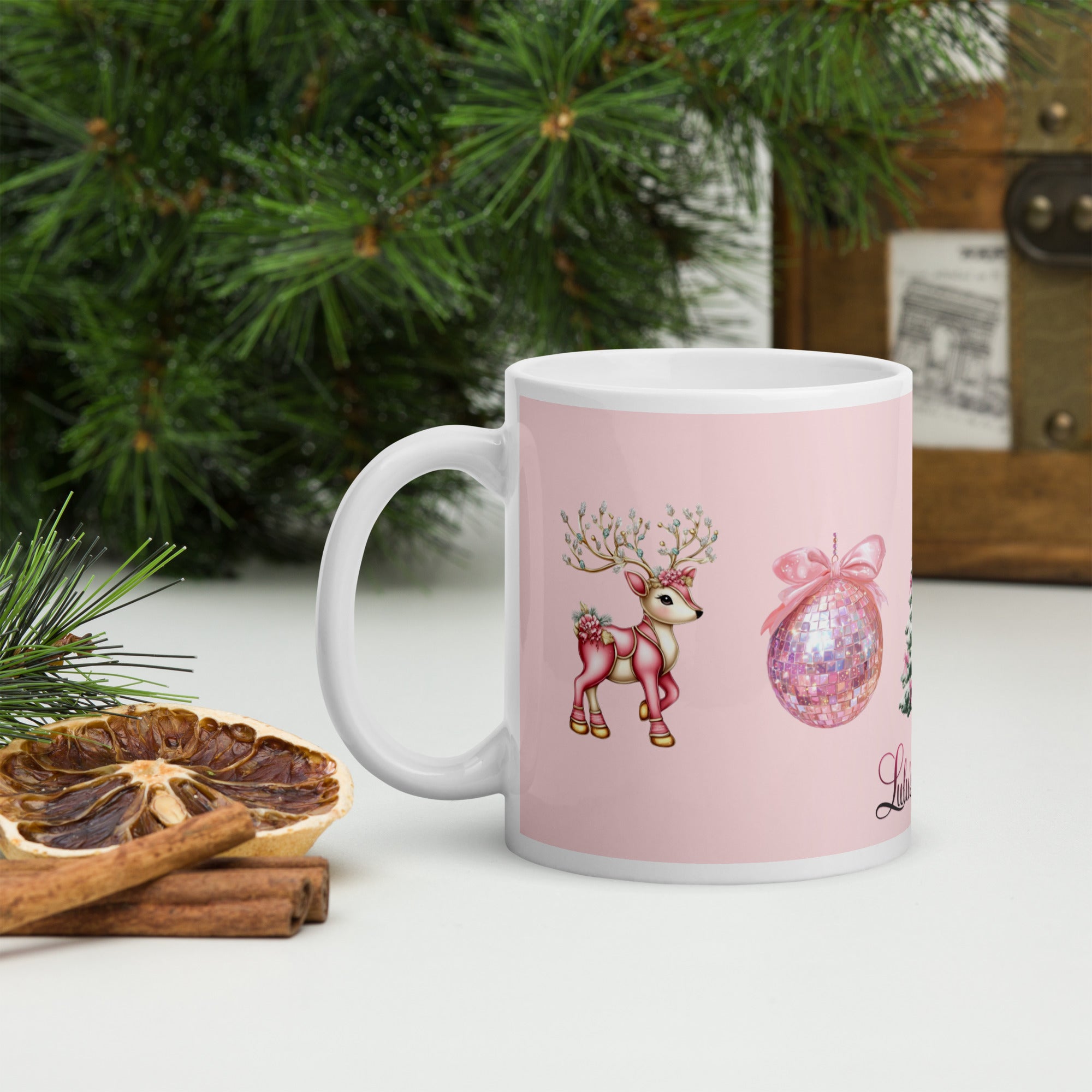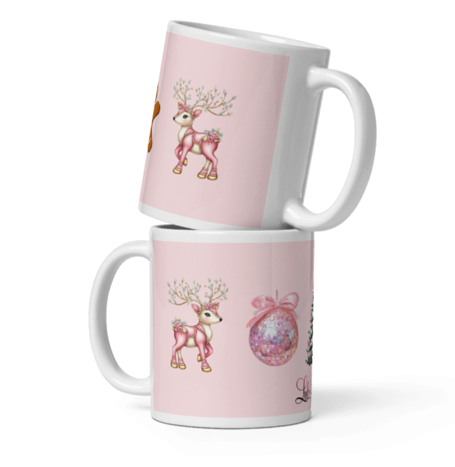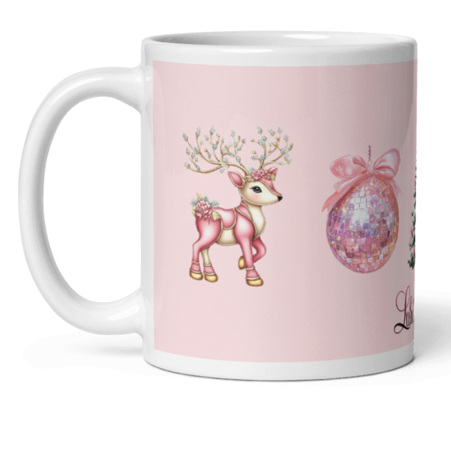 Celebrate the festive season with the 'Pink Christmas Wonderland' Mug, featuring charming designs of pink reindeer, a gingerbread man, a stylish Christmas tree, and a glittering pink disco ball against a soft pink background. This mug blends whimsical holiday imagery with elegant tones, making it perfect for adding a unique, sophisticated touch to your seasonal drinkware collection. Ideal for cozy mornings or holiday gatherings, it offers both festive cheer and a distinctive aesthetic flair.