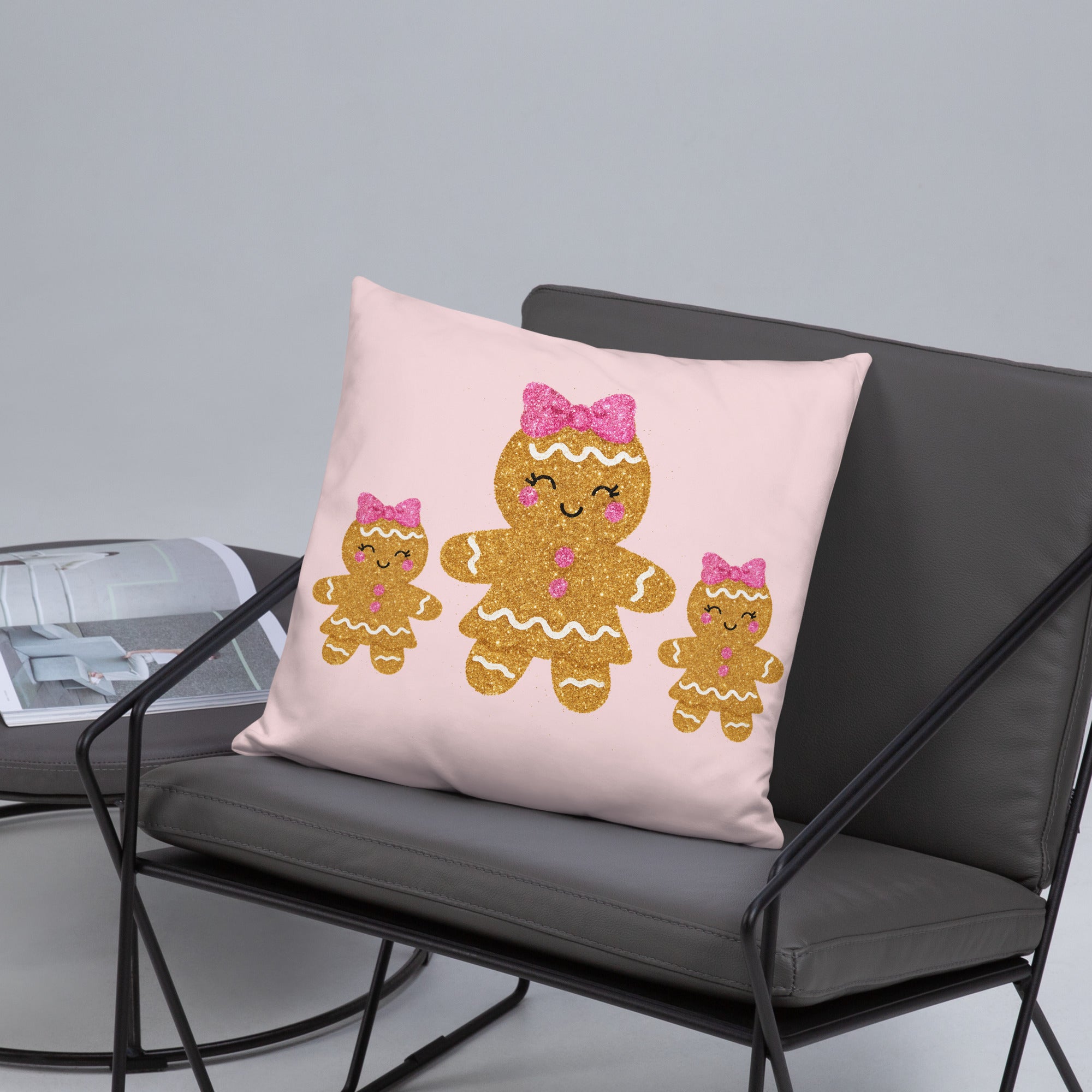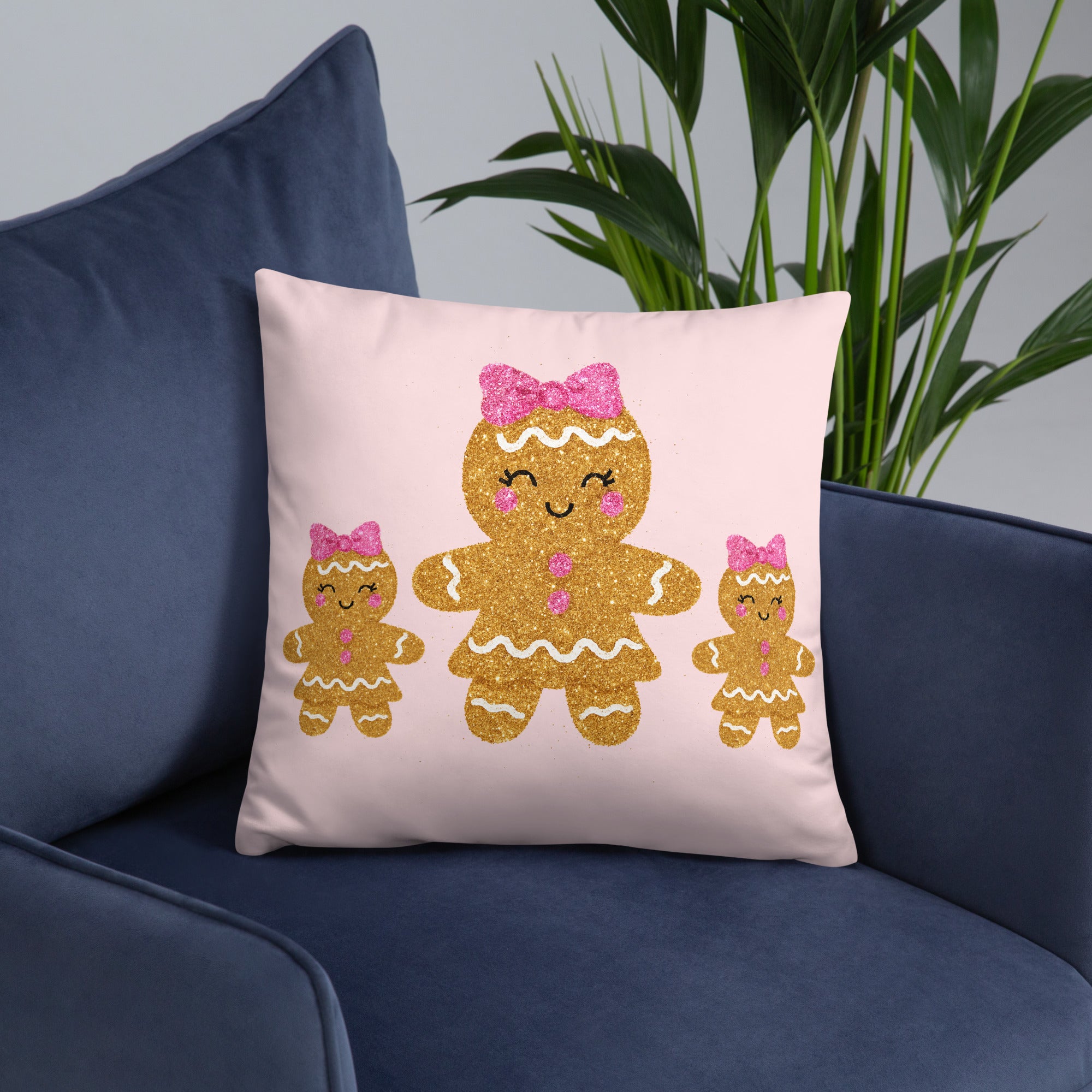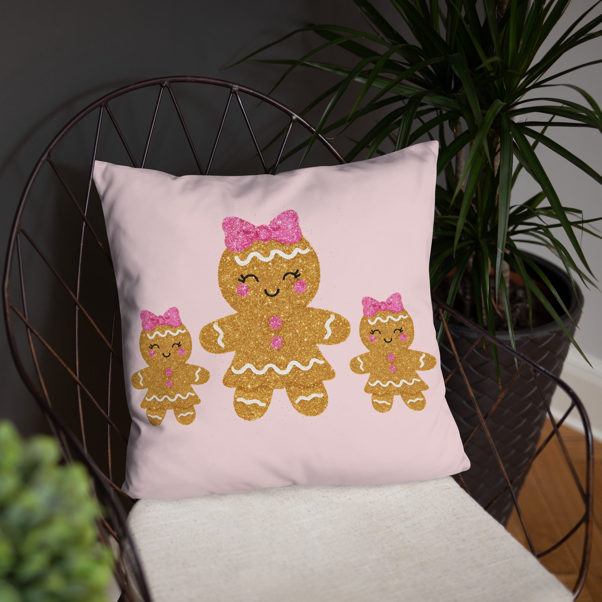 Bring festive sparkle to your home with this charming throw pillow featuring three gingerbread ladies adorned with glittery details and signature pink bows. The design appears on both front and back, showcasing one larger gingerbread woman alongside two smaller gingerbread girls, each shimmering with holiday glamour. Perfect for adding a touch of whimsical elegance to your seasonal décor, this soft basic pillow combines playful design with sophisticated sparkle for a festive accent that catches the light beautifully.