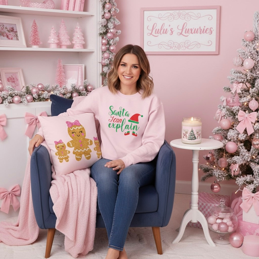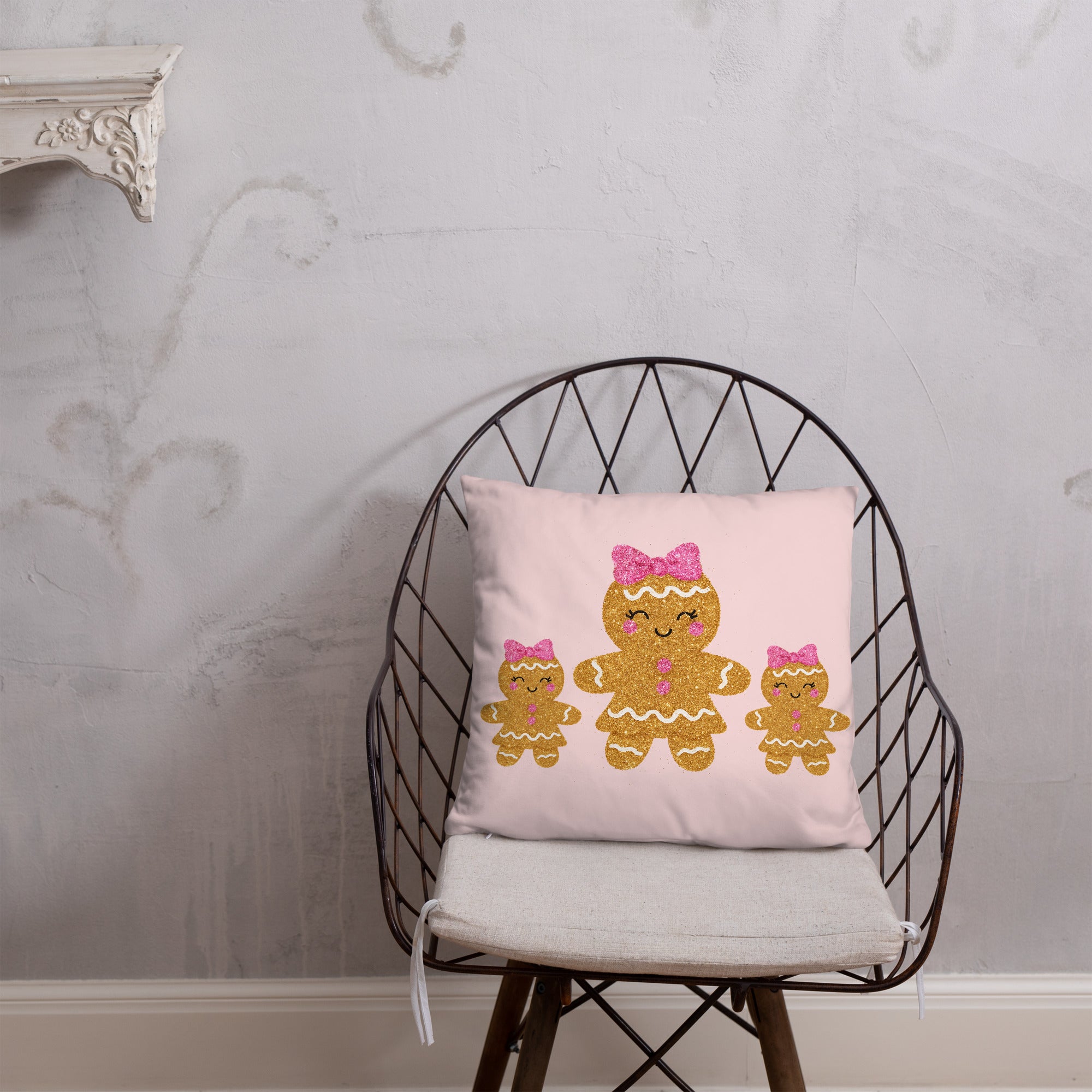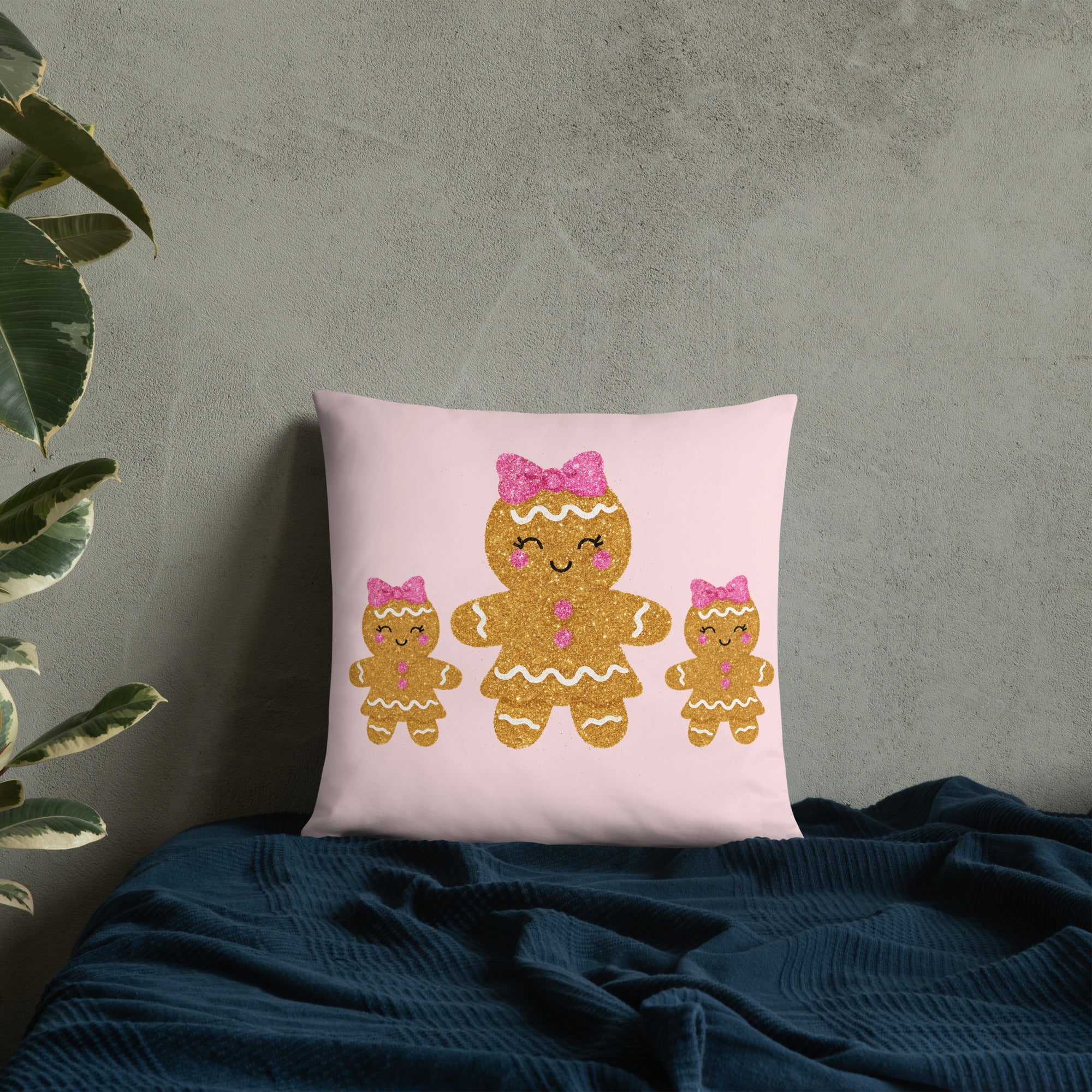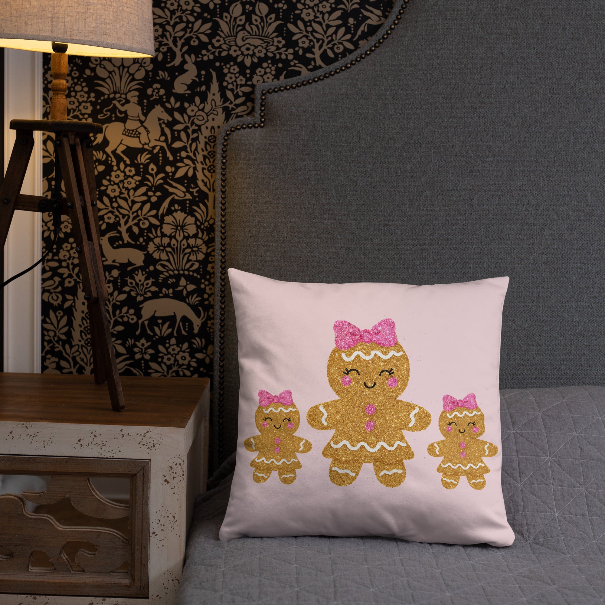 Bring festive sparkle to your home with this charming throw pillow featuring three gingerbread ladies adorned with glittery details and signature pink bows. The design appears on both front and back, showcasing one larger gingerbread woman alongside two smaller gingerbread girls, each shimmering with holiday glamour. Perfect for adding a touch of whimsical elegance to your seasonal décor, this soft basic pillow combines playful design with sophisticated sparkle for a festive accent that catches the light beautifully.