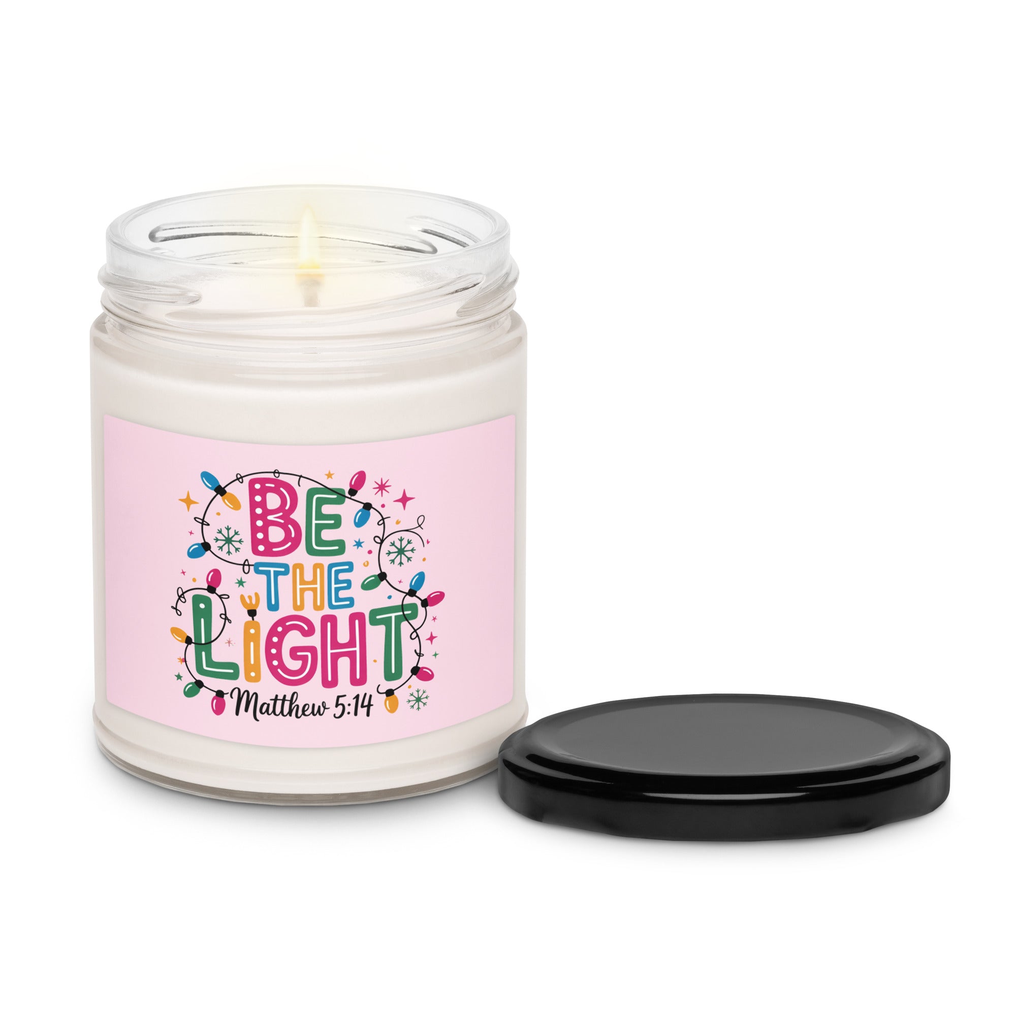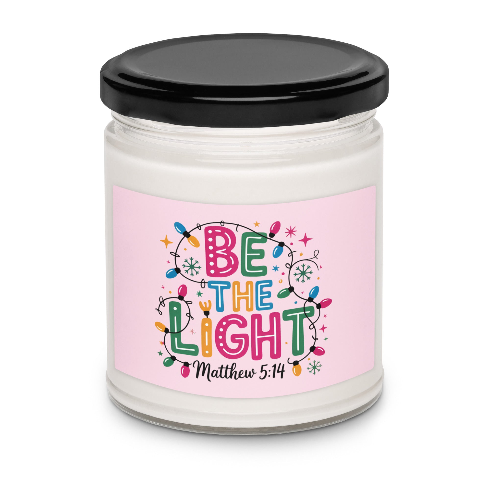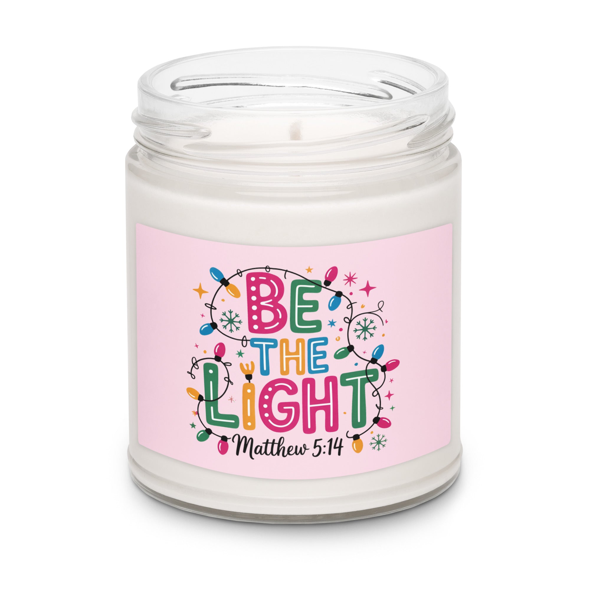 Illuminate your space with the 'Be The Light Matthew 5:14' scented soy candle, inspired by the biblical call to shine brightly. Set against a soft pink, feminine background and a string of Christmas lights, this candle offers a serene and uplifting ambiance. Crafted from natural soy wax, it burns cleanly and evenly, making it an ideal gift for friends, family, or Bible study groups seeking inspiration and warmth. Embrace light and faith in your daily environment with this beautiful, meaningful candle.