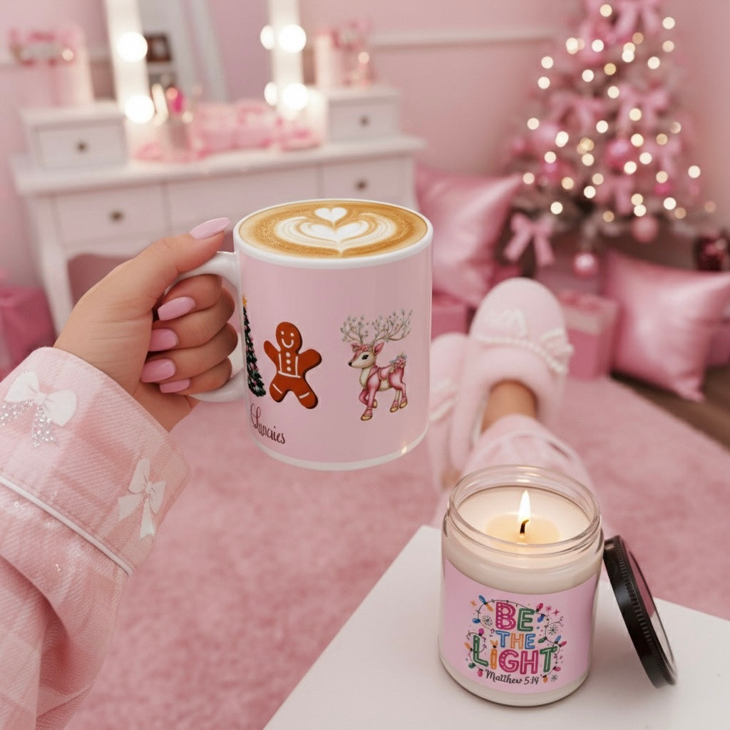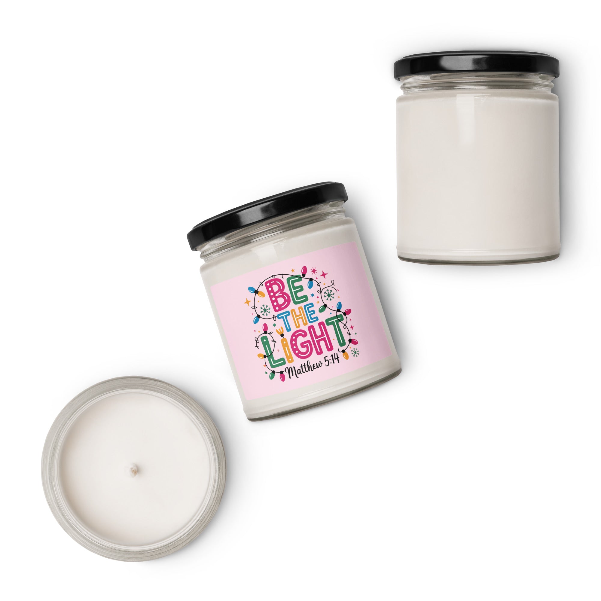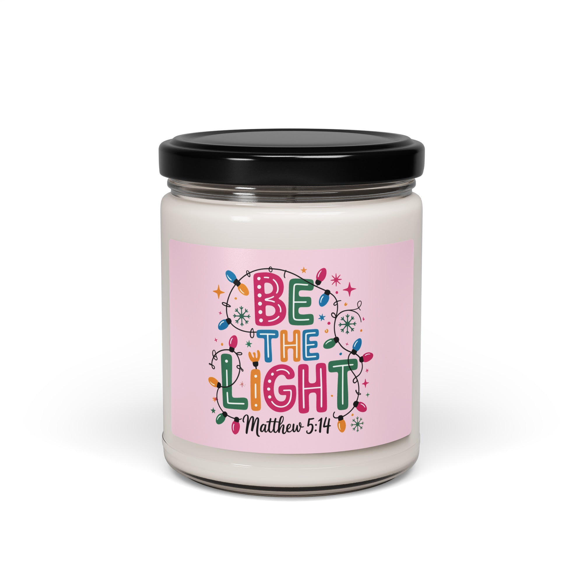 Illuminate your space with the 'Be The Light Matthew 5:14' scented soy candle, inspired by the biblical call to shine brightly. Set against a soft pink, feminine background and a string of Christmas lights, this candle offers a serene and uplifting ambiance. Crafted from natural soy wax, it burns cleanly and evenly, making it an ideal gift for friends, family, or Bible study groups seeking inspiration and warmth. Embrace light and faith in your daily environment with this beautiful, meaningful candle.